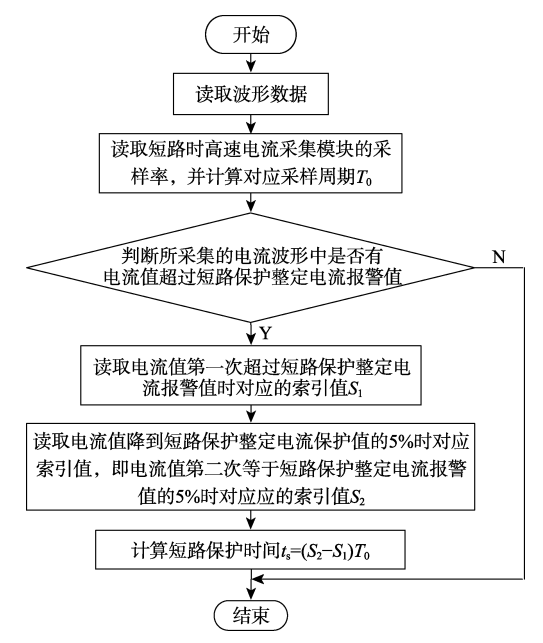 電氣防火限流保護器完成短路限流時間為從流過保護器的短路故障電流值超過短路保護整定電流報警值時到短路故障電流降到其值5%時的時間間隔。短路限流時間計算子程序如圖10所示。